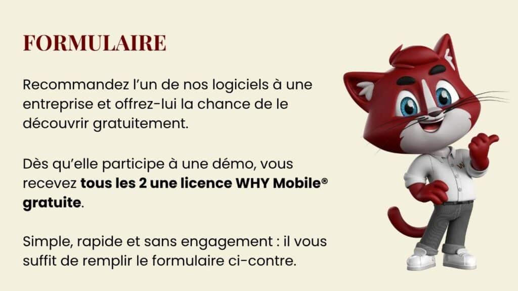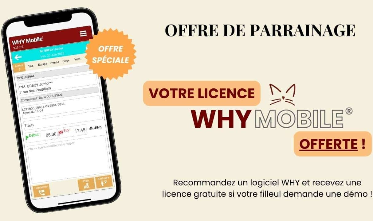 - Après la démo gratuite réalisée, vous et votre filleul recevez chacun une licence WHY Mobile® offerte.